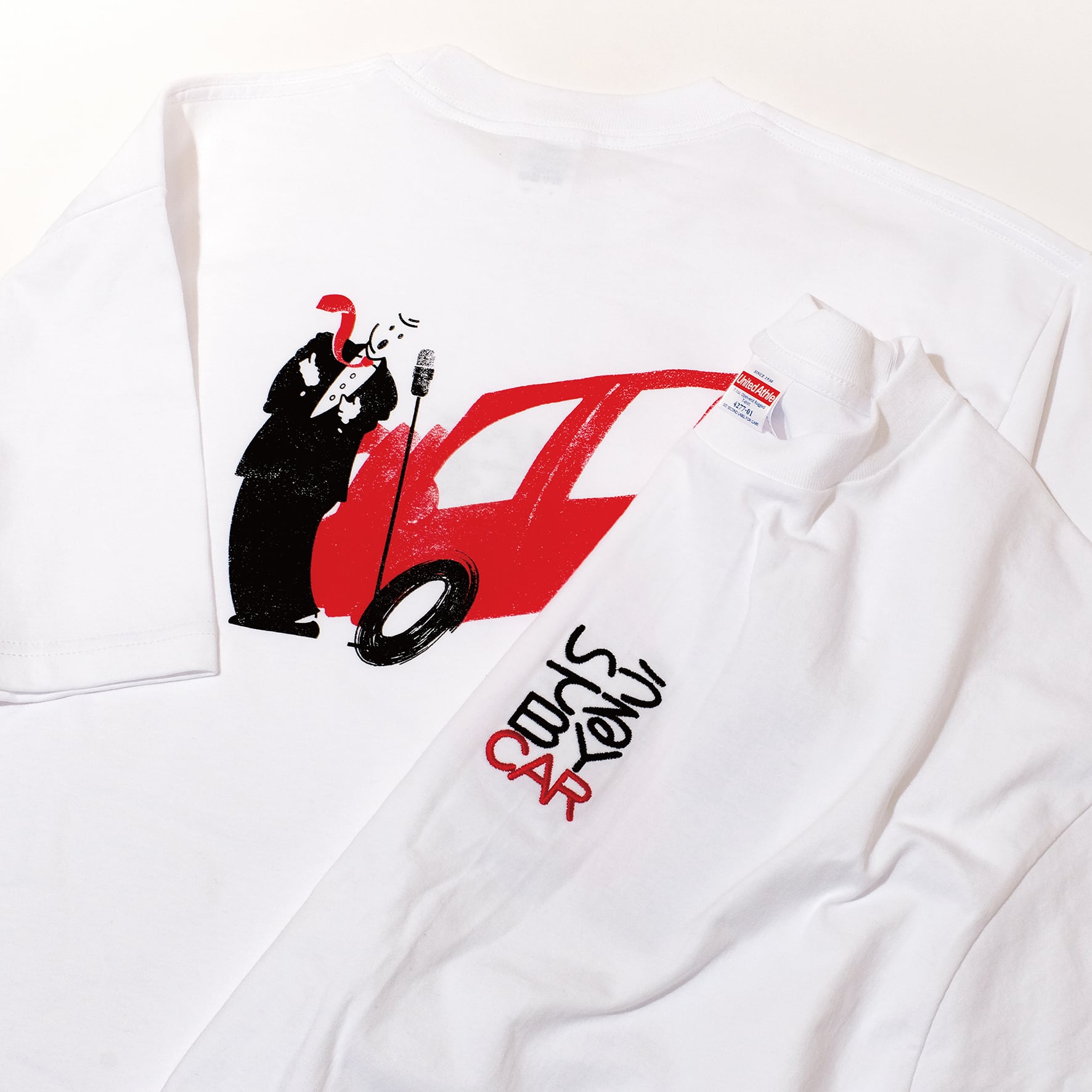 前面に「いうてるBY CAR(いうてる場合か)」のタイポグラフィの刺繍、背面にイラストのシルクスクリーン印刷を施したTシャツ。7.1ozの厚め生地。