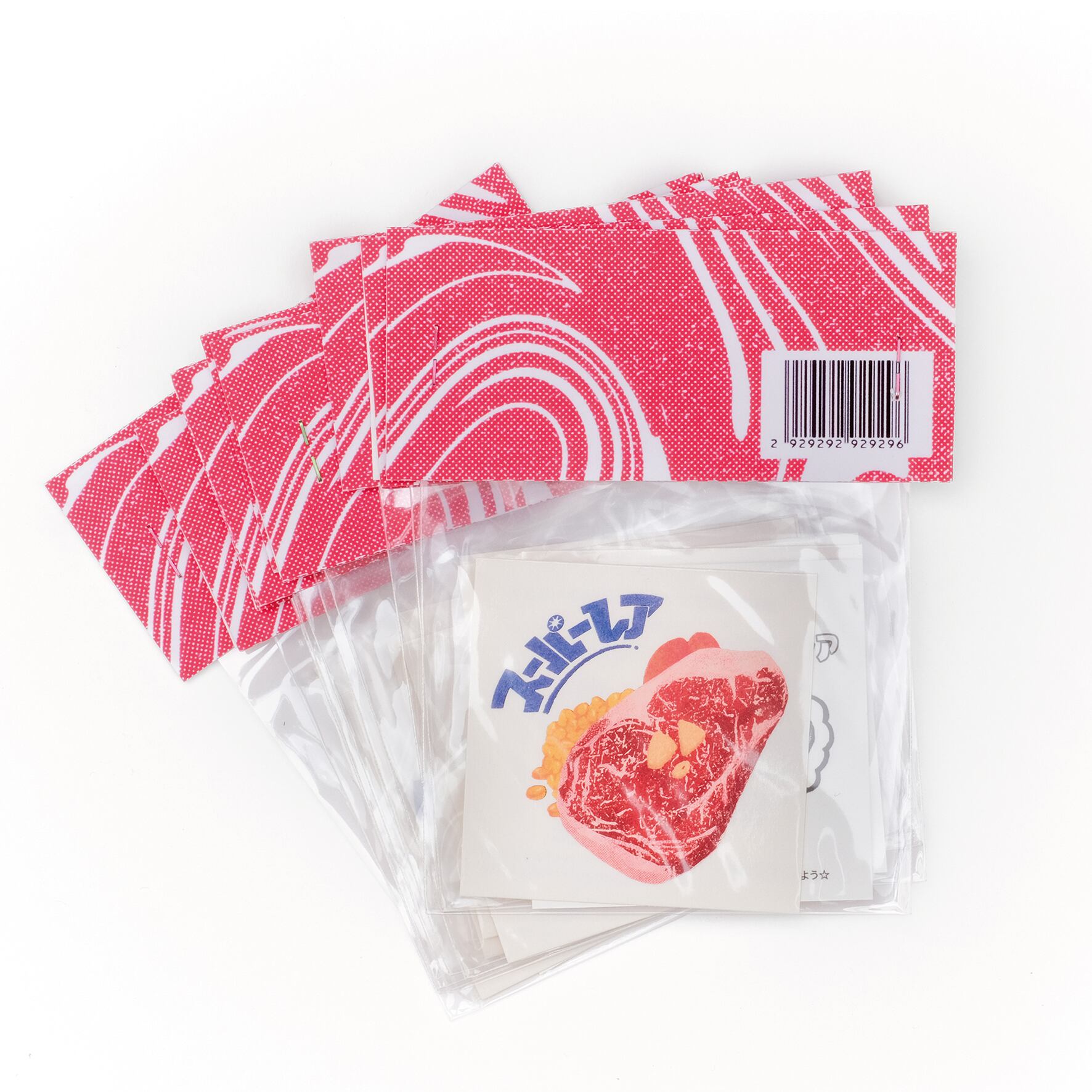極限までレアな焼き加減(?)のステーキのイラストを施したステッカー。SSRとSRの2枚組でSSRはキラキラのビッ●リマン仕様。